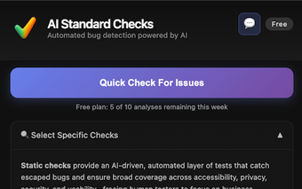 Testers.AI Standard Checks to rozszerzenie do przeglądarki Chrome, które pozwala na automatyczne wykrywanie błędów i problemów na stronach internetowych. Dzięki zaawansowanej technologii AI, użytkownicy mogą przeprowadzać ponad 1000 standardowych kontroli w celu identyfikacji problemów zaledwie jednym kliknięciem. To narzędzie jest szczególnie przydatne dla testerów oprogramowania oraz deweloperów, którzy chcą zwiększyć efektywność swoich działań związanych z testowaniem stron internetowych.